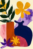 De compositie kenmerkt zich door gedurfde, geschilderde vormen en een spel van overlappende kleurvlakken die een dynamische ruimte creëren. Twee prominente vazen, de een in een tint van diepblauw en de ander in een rijke terracotta,…