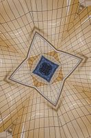 Dit strakke, abstracte kunstwerk is geworteld in de architectuur van de Van Nelle Fabriek in Rotterdam, een meesterwerk van het Nieuwe Bouwen. Het is opgebouwd uit een caleidoscopisch patroon van warme, beige/gele tinten en strakke, contrasterende zwarte lijnen. De compositie creëert een gevoel van diepte en optische illusie, alsof men in een architecturale tunnel van vervormde ruimtes kijkt. De lijnen op de achtergrond lijken te golven en buigen, wat een dynamisch, vervormd effect geeft, terwijl de stervormige opening in het midden een diepe, donkere kern onthult.