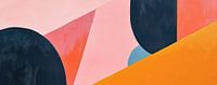 Geometrisch Kleurenspel - Dit abstracte schilderij kenmerkt zich door een spel van geometrische vlakverdeling met dominante ronde en schuine vormen in een palet van zwart, roze, oranje en blauw.