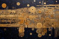 Dit werk toont een verzameling geometrische vormen en lijnen in goud. De compositie bestaat uit verschillende cirkels en rechthoeken die een gevoel van balans en structuur creëren. De abstracte opstelling doet denken aan een mechanisch ontwerp, waardoor het een moderne en futuristische uitstraling heeft.