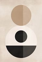 Minimalistische abstracte compositie die speelt met geometrische vormen en een beperkt kleurenpalet. De afbeelding bestaat uit twee gestapelde cirkels, waarbij de bovenste cirkel in twee halve tonen is verdeeld en de onderste cirkel een kleiner zwart en wit segment bevat. Deze vormen zijn geplaatst tegen een neutrale achtergrond die varieert in tinten van beige. Het ontwerp is strak en de balans tussen de elementen suggereert een zekere harmonie en eenvoud. De tegenstelling tussen de volle en halve tinten creëert een interessante dynamiek, terwijl het gebruik van zwart en wit een tijdloze kwaliteit aan het stuk verleent.
