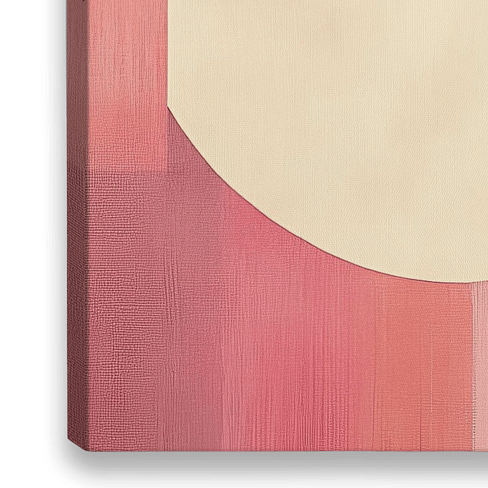 Geometrisch Roze - Dit abstracte schilderij kenmerkt zich door een dynamische compositie van geometrische vormen zoals cirkels en vierkanten, en de overwegend roze en beige kleurstelling zorgt voor een rustige maar levendige uitstraling.
