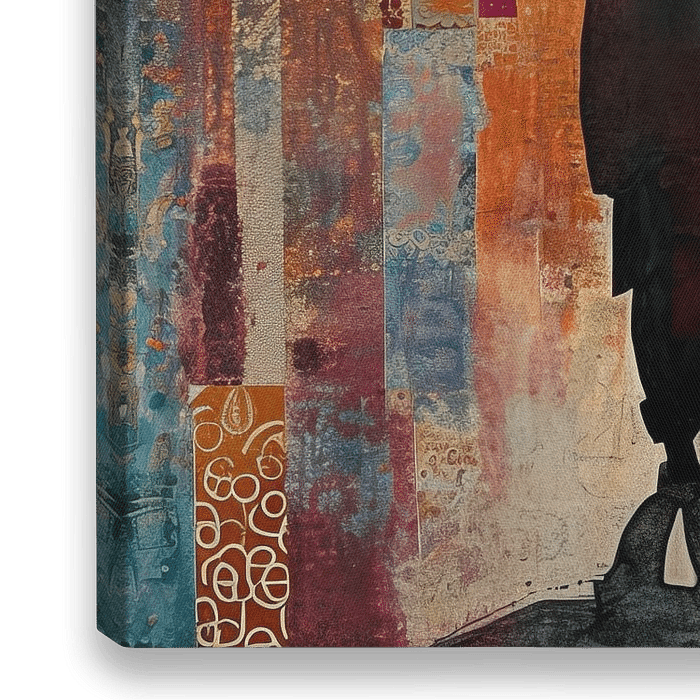 Geometrisch Silhouet - Hier zie je een intrigerend abstract werk waarbij een eenzaam silhouet aan de rand van geometrische en etnisch geïnspireerde patronen staat, die een pad naar een onbestemde horizon creëren. De textuurrijke achtergrond wisselt tussen warme aardetinten en koelere blauwe schakeringen, met speelse accenten van rood en…
