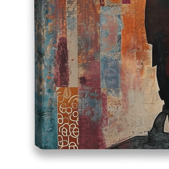 Geometrisch Silhouet - Hier zie je een intrigerend abstract werk waarbij een eenzaam silhouet aan de rand van geometrische en etnisch geïnspireerde patronen staat, die een pad naar een onbestemde horizon creëren. De textuurrijke achtergrond wisselt tussen warme aardetinten en koelere blauwe schakeringen, met speelse accenten van rood en…