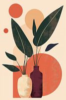 Een stijlvol minimalistisch kunstwerk waarin twee elegante vazen, één in warm beige en één in diep burgundy, worden omringd door geometrische cirkels in terracotta tinten. De compositie wordt verlevendigd door sierlijke donkergroene bladeren die een natuurlijke dynamiek toevoegen aan het verder strakke ontwerp. Het geheel straalt rust en harmonie uit tegen een zachte beige achtergrond.