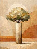 Dit kunstwerk presenteert een unieke fusie van organische vormen en geometrische abstractie. Een gestileerde boom met een ronde, mozaïekachtige kruin staat geplant in een hoge, cilindervormige vaas en vormt een opvallend verticaal middelpunt. De achtergrond bestaat uit grote, zachte geometrische bogen en rondingen in warme aardetinten…