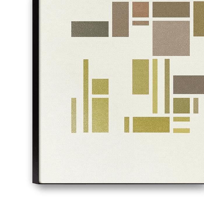 Een geometrisch kunstwerk in natuurlijke tinten, groen oranje en beige met een zachtgele achtergrond.