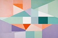 Dit geometrische ontwerp combineert zachte pastelkleuren met strakke lijnen en vormen, wat een rustige en moderne uitstraling creëert. De abstracte vormen in het ontwerp vloeien naadloos in elkaar over, waardoor het perfect past in een eigentijds interieur. De kleuren, variërend van zachte groentinten tot subtiele oranje en paarse accenten, geven het werk een aangename, harmonieuze sfeer. Ideaal voor ruimtes waar een rustige maar stijlvolle uitstraling gewenst is, zoals een woonkamer of kantoor. De geometrische compositie zorgt ervoor dat het ontwerp visueel interessant blijft, zonder dat het de aandacht overheerst. Dit kunstwerk is een prachtige toevoeging voor liefhebbers van abstracte kunst die houden van subtiele, maar boeiende kleurcombinaties.
