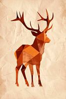 Een majestueus hert ontvouwt zich in veelzijdige, warme bruine tinten die doen denken aan herfstige bossen. Zijn imposante, vertakte gewei lijkt naar de hemel te reiken, terwijl de geometrische vormen hem een modern, gestileerd karakter geven. De delicate papieren achtergrond versterkt de artistieke uitstraling en laat het hert uit een ander tijdperk lijken.