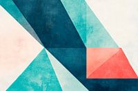 Geometrische vormen ontvouwen zich in zachte watermeloen- en koele blauwtinten en creëren een harmonieus samenspel tussen licht en schaduw. Deze abstracte compositie straalt moderne elegantie uit en is perfect voor een woonkamer, waar het fungeert als een boeiend gespreksonderwerp en stijlvol hoogtepunt.
