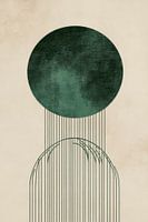 Een mysterieuze, donkere cirkel zweeft boven zachte, golvende lijnen die het onderste deel van de foto omarmen als stromend water. Het subtiele kleurenpalet van diepgroene en zachte aardetinten creëert een harmonieus evenwicht, terwijl de verticale strepen lijken op regenachtige tranen die je uitnodigen om te rusten. Er ontvouwt zich een spel tussen hemel en aarde.