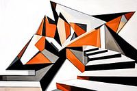 Dit kunstwerk is een fascinerend voorbeeld van geometrisch abstracte kunst. Het maakt gebruik van strakke lijnen, scherpe hoeken en een gedurfde kleurenschema van oranje, zwart en grijs. De figuren lijken te draaien en veranderen van perspectief, wat het werk een dynamisch gevoel geeft. De trapvormen brengen de kijker verder in het ontwerp, wat doet denken aan beweging en diepte. Dit ontwerp is perfect voor een moderne en minimalistische ruimte, waar het zijn energie en abstracte schoonheid volledig tot zijn recht kan laten komen. Of je nu houdt van kunst die uitdaagt of simpelweg iets zoekt om je interieur te verfraaien, dit stuk past bij elke ruimte die karakter nodig heeft.