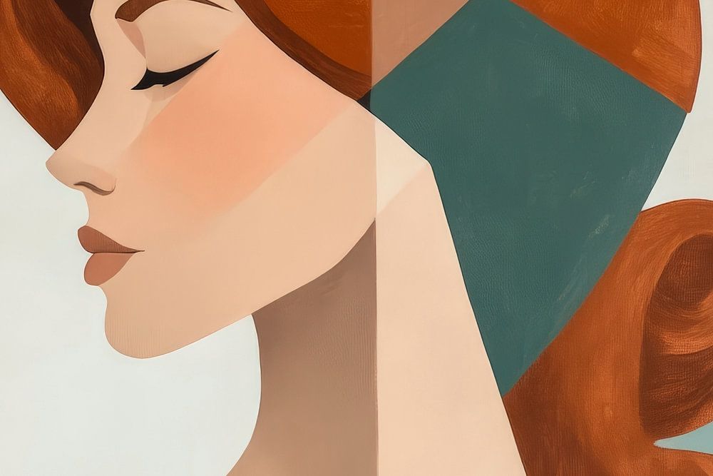 Een harmonieuze compositie van zachte kleuren en geometrische vormen ontvouwt de gratie van een bedachtzaam vrouwenfiguur. De warme rode tinten van het haar contrasteren indrukwekkend met koele groene accenten. Dit kunstwerk brengt een tijdloze elegantie en rust in elke kamer, vooral in een stijlvolle woonkamer of moderne slaapkamer.