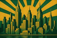 Geometrische wolkenkrabbers rijzen trapsgewijs op voor een grote zon, terwijl strakke stralen als een waaier over de lucht lopen. De krachtige tweekleurige combinatie van diepgroen en warm geel creëert een grafisch contrast met een retro-inslag. Voorgrondreflecties suggereren water, wat diepte toevoegt aan de strakke lijnen en scherpe…
