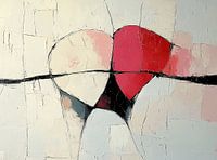 Geometrische Balans in Rood - Dit abstracte schilderij kenmerkt zich door de dominante aanwezigheid van zachte textuurcontrasten en geometrische vormen, waarbij een grote, opvallende rode vorm centraal staat, omgeven door witte en zwarte lijnen met vleugjes roze en grijze schakeringen die een gevoel van rust en balans…