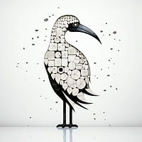 In dit abstracte werk ontvouwt zich een harmonie van geometrische vormen en fabelachtige vogelverschijning tegen een serene witte achtergrond.