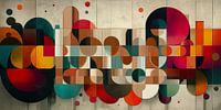 Geometric Harmony is een verbluffend abstract kunstwerk dat de kracht van geometrische vormen combineert met warme, aardse kleuren. Het werk bestaat uit een reeks grote, met precisie geplaatste cirkels en rechthoeken, die een perfecte balans creëren tussen organische vormen en strakke lijnen. De diepgaande kleuren zoals rood, oranje, en groen komen samen in een dynamisch patroon dat tegelijkertijd rustig en energiek aanvoelt. De subtiele variaties in de textuur van de vormen versterken de visuele aantrekkingskracht van het kunstwerk en nodigen de kijker uit om de harmonie in de chaos te ervaren. Dit werk doet denken aan de invloed van minimalistische kunst, maar voegt daar een extra laag van complexiteit en speelsheid aan toe. Het contrasteert met het geometrische raster door de gebruik van verschillende texturen en gradaties van kleur, waardoor het stuk zowel verfijnd als uitnodigend is. Geometric Harmony brengt de schoonheid van evenwicht en symmetrie naar voren, met een subtiele boodschap over de kunst van het combineren van tegengestelden.