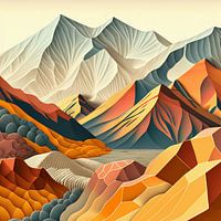 Dit abstracte kunstwerk toont een kleurrijk, gelaagd berglandschap met een harmonieuze mix van warme en koele tinten. De bergen zijn afgebeeld met vloeiende lijnen en geometrische facetten die oranje-, rood-, geel- en groentinten mengen. Op de voorgrond creëren glooiende heuvels en afgeronde boomachtige vormen diepte, terwijl het midden…