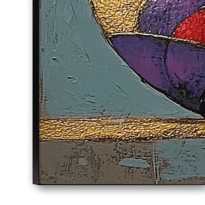 Geometrische Kommen | Symphony of Shapes and Shades - Dit stilleven schilderij toont een reeks van geometrisch gestileerde kommen in een rij, uitgevoerd in rijke kleuren zoals goud, blauw en rood, en contrasterend met een ruw getextureerde achtergrond.