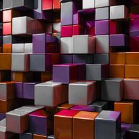 In dit werk verkennen we de esthetiek van geometrie en reflectie, waarbij elk blok zorgvuldig is geplaatst om een zinsbegoochelend effect te creëren. De zachte glans op elk oppervlak vangt en buigt het licht, waardoor een verbluffend spel van schaduwen en highlights ontstaat. De geselecteerde kleuren variëren van warme amber en dieprood tot koelere tinten van lila en grijs, wat een visueel boeiend spectrum creëert.