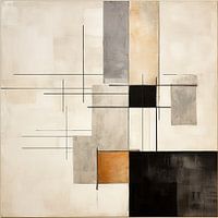 Geometrische Rust - Dit abstracte werk speelt met een harmonieus palet van neutrale tinten, verrijkt met accenten van oranje en zwart. De geometrische compositie, met zijn strakke lijnen en vlakken, suggereert een rustige balans en understated elegantie die kan resoneren in een modern of minimalistisch interieur.