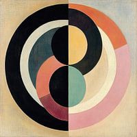 Geometrische Symmetrie - Dit abstracte schilderij presenteert een grote geometrische compositie van ineengrijpende cirkels en bogen in diverse aardetinten en pastelkleuren, verdeeld door een centrale verticale lijn die de symmetrie benadrukt.