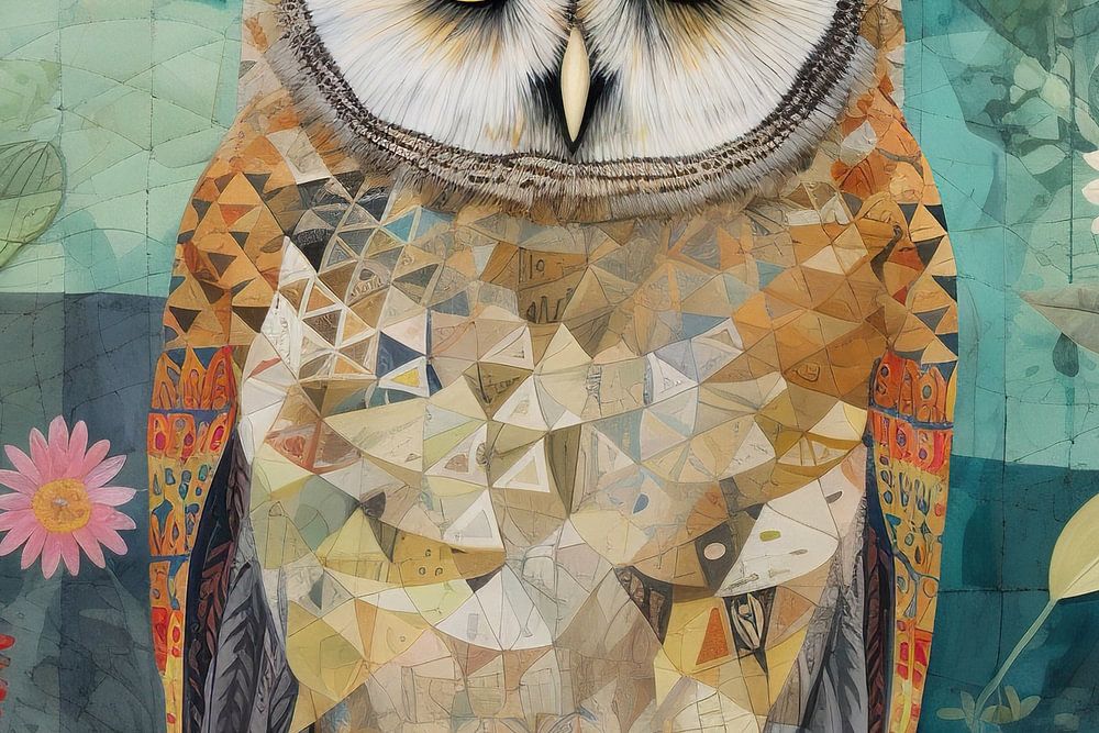 Geometrische Uil | Uil Kunstwerk - Dit boeiende kunstwerk toont een uil, gezeten op een tak, te midden van een overvloed aan bloemen en flora. De uil zelf is opgebouwd uit geometrische patronen die speels contrasteren met de schilderachtige, bijna aquarel-achtige achtergrond. Schakeringen van groen, gekoppeld aan de terracotta- en pastelkleurige bloemen, geven het geheel een natuurlijk en toch gestileerde uitstraling.