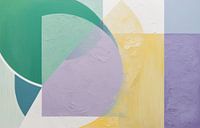 Dit abstracte ontwerp speelt met geometrische vormen en subtiele kleuren om een moderne en serene sfeer te creëren. De overlapping van halve cirkels, vierkanten en rechthoeken in verschillende tinten groen, geel, paars en wit zorgt voor een dynamisch maar toch rustgevend effect. Door het gebruik van zachte kleuren en strakke lijnen heeft het werk een minimalistische uitstraling, perfect voor moderne interieurs. De textuur van het ontwerp geeft een gevoel van diepte, waardoor het visueel interessant blijft zonder te veel af te leiden. Dit ontwerp past uitstekend in een kantoor of slaapkamer waar een gevoel van rust en balans gewenst is.