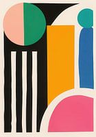 Een harmonieus abstract kunstwerk dat speelt met heldere vormen en zachte kleurtinten. Een gedeeld turquoise rondje, verticale lijnen in wit en een sterk oranje creëren een evenwichtige compositie op een crèmekleurige achtergrond. De combinatie van roze, blauw, groen en wit creëert een minimalistisch maar levendig spanningsveld. Het…