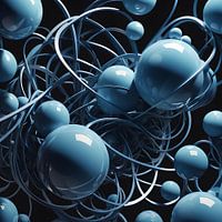 Dit kunstwerk toont een fascinerend spel van glanzende blauwe bollen die met elkaar verweven zijn door sierlijke, kronkelende lijnen. De bollen lijken bijna gewichtloos te zweven in een abstracte ruimte, wat een dynamisch en intrigerend effect geeft. De compositie doet denken aan elementen uit de moderne kunststromingen zoals het kubisme en futurisme, waarbij vormen en beweging centraal staan.