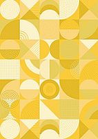 Een geometrische compositie in geel en goud. Abstracte kunst met een huis vintage. Geweldige vormen spelen met elkaar en brengen een vrolijke stemming over.
