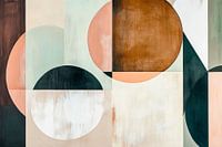 Zachte aardetinten en harmonieuze geometrische vormen geven dit kunstwerk een rustgevende uitstraling. De combinatie van ronde en rechthoekige elementen creëert een unieke balans die perfect past in een moderne woonkamer of een creatieve hoek op kantoor. Ideaal om een ontspannen sfeer te bevorderen en tegelijkertijd het gevoel voor esthetiek aan te scherpen.