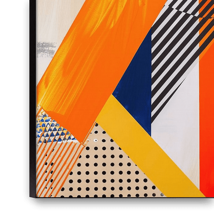 Dit fascinerende schilderij combineert dynamische lijnen, krachtige kleuren en geometrische vormen tot een harmonieuze compositie. De levendige oranje, blauwe en gele kleuren contrasteren fel met de getextureerde zwarte lijnen en stippen. Geïnspireerd door de abstracte en concrete kunst van de jaren 1920, straalt dit werk een moderne,…