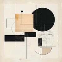 Geometrische vormen dansen in een harmonieus samenspel van zwart, beige en verschillende texturen. Royale cirkels en precieze lijnen trekken het oog, terwijl een dramatisch contrast tussen licht en donker spanning creëert. Deze compositie straalt evenwicht en tijdloze elegantie uit, alsof het verhalen uit een abstracte wereld vertelt.