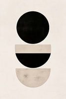 Een indrukwekkende compositie ontvouwt zich in een harmonieus samenspel van geometrische vormen. Een sterke, zwarte cirkel zweeft aan de bovenkant, terwijl twee halve bollen in zachte kleuren het evenwicht eronder bewaren. De heldere lijnen en het spel van licht en schaduw creëren een fascinerende visuele diepte die tot nadenken stemt.