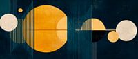 Een harmonieuze compositie van lichtgevende gouden en kalmerende witte cirkels op een diepblauwe achtergrond biedt een perfecte combinatie van moderniteit en elegantie. De geometrische vormen en zachte lijnen stralen een kalme energie uit. Ideaal voor een stijlvolle woonkamer, het zet een inspirerend accent en nodigt uit om te blijven hangen.