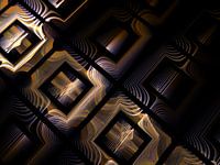 Dit digitale kunstwerk toont een abstracte compositie van geometrische vormen - voornamelijk vierkanten en rechthoeken - verbonden door fijne lijnen en golfachtige patronen. Het kleurenpalet is donker, met dominante gouden en paarse tinten die het beeld een nobele, bijna mystieke uitstraling geven. De lijnen lijken precies en tegelijkertijd organisch, waardoor een spannende balans ontstaat tussen structuur en beweging.