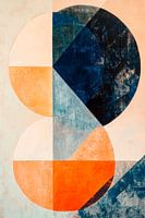 Zachte kleuren en geometrische vormen komen samen in een harmonieus samenspel van blauw, oranje en aardetinten. Deze compositie straalt rust en elegantie uit en voegt tegelijkertijd een modern accent toe aan de kamer. Ideaal voor de woonkamer, het creëert een uitnodigende sfeer die uitnodigt om te blijven hangen.
