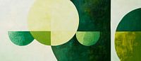 Met zachte groene tinten en harmonieuze vormen ontvouwt zich een modern samenspel van cirkels en bogen. Deze gestileerde compositie straalt sereniteit en frisheid uit, ideaal om een sfeer van creativiteit te creëren in een keuken of woonkamer. De heldere lijnen en harmonieuze kleurstellingen nodigen uit om te blijven hangen en te ontspannen.