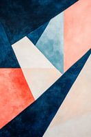 Geometrische vormen in een harmonieuze kleurencombinatie van zachte rode en blauwe tinten trekken onmiddellijk de aandacht. De dynamische lijnen en abstracte oppervlakken stralen een moderne esthetiek uit die perfect past in een stijlvolle woonkamer. Hier wordt een sfeer van creativiteit en eigentijds design gecreëerd.