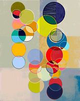 Een modern abstract kunstwerk met overlappende cirkels in felle, contrasterende kleuren gelaagd op zachte rechthoekige achtergronden, waardoor een dynamische balans van geometrie en textuur ontstaat.