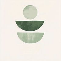 Er ontvouwt zich een harmonieus arrangement van zachte groene tinten, bestaande uit een perfecte, zwevende bol en twee royale halve cirkels. De minimalistische vormen stralen rust uit en nodigen de kijker uit om zich onder te dompelen in een wereld van evenwicht en balans. Een spel van texturen en schaduwen verrijkt de visuele ervaring.
