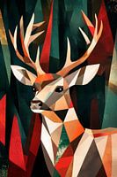Een majestueus hert met geometrische vormen en heldere aardse kleuren springt in het oog. De gedurfde kleurcontrasten tussen warm rood en diep groen geven het dier een bijzondere diepte. Deze fascinerende graphic past perfect in een moderne woonkamer en brengt de natuur in stijl in huis.