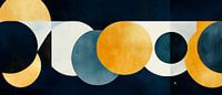 Een fascinerende compositie van geometrische vormen ontvouwt zich in harmonieuze aardetinten en elegant zwart. De glinsterende gouden cirkels geven het geheel een luxueuze uitstraling. Ideaal voor een stijlvolle woonkamer die hedendaagse elegantie combineert met een vleugje warmte en uitnodigt om te blijven hangen.
