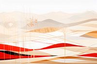 Minimalistische kunst met geometrische vormen. Het abstracte ontwerp toont een winterlandschap in warme, feestelijke kleuren.