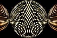 Fotobewerking van grafische geometrische kunst van cirkels, halve cirkels en lijnenspel tegen een donkere achtergrond.