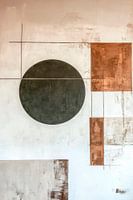 Een harmonieus samenspel van geometrische vormen en aardse kleuren ontvouwt zich tegen een neutrale achtergrond. De grote, donkere cirkel trekt de aandacht, terwijl de warme rechthoeken met hun rustieke textuur een uitnodigend accent vormen. Ideaal voor een moderne woonkamer die stijl en gezelligheid perfect combineert.