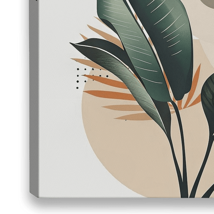 Deze fascinerende plantencompositie combineert de helderheid van geometrische vormen met de weelderige levendigheid van tropische bladeren. De weelderige groene bladeren contrasteren harmonieus met de subtiele beige en olijfkleurige cirkels en lijnen op de achtergrond, waardoor het schilderij een subtiele maar krachtige dynamiek krijgt.…