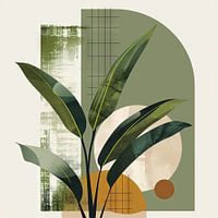 Deze fascinerende plantencompositie combineert de helderheid van geometrische vormen met de weelderige levendigheid van tropische bladeren. De weelderige groene bladeren contrasteren harmonieus met de subtiele beige en olijfkleurige cirkels en lijnen op de achtergrond, waardoor het schilderij een subtiele maar krachtige dynamiek krijgt.…