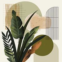 Deze fascinerende plantencompositie combineert de helderheid van geometrische vormen met de weelderige levendigheid van tropische bladeren. De weelderige groene bladeren contrasteren harmonieus met de subtiele beige en olijfkleurige cirkels en lijnen op de achtergrond, waardoor het schilderij een subtiele maar krachtige dynamiek krijgt. Dit werk is ideaal voor liefhebbers van abstracte kunst en natuurmotieven en brengt een frisse, rustgevende sfeer in elke kamer. Een echte blikvanger die de natuurlijke schoonheid van tropische planten op een moderne manier interpreteert.
